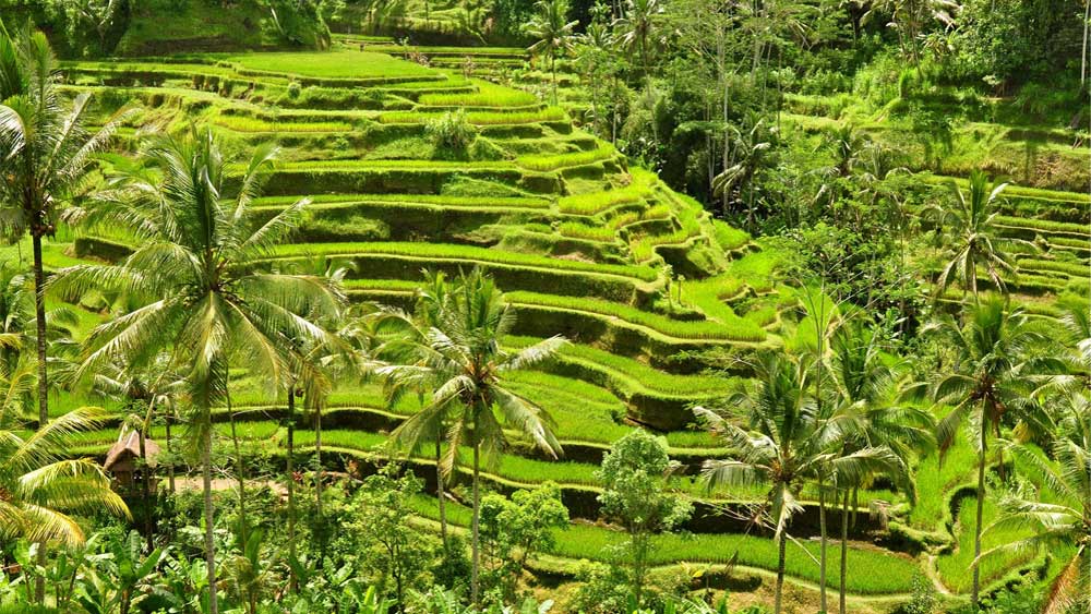 Tegallalang Rice Terraces in Ubud is famous for its beautiful scenes of rice paddies involving the subak (traditional Balinese cooperative irrigation system), which according to history, was passed down by a revered holy man named Rsi Markandeya in the eighth century.